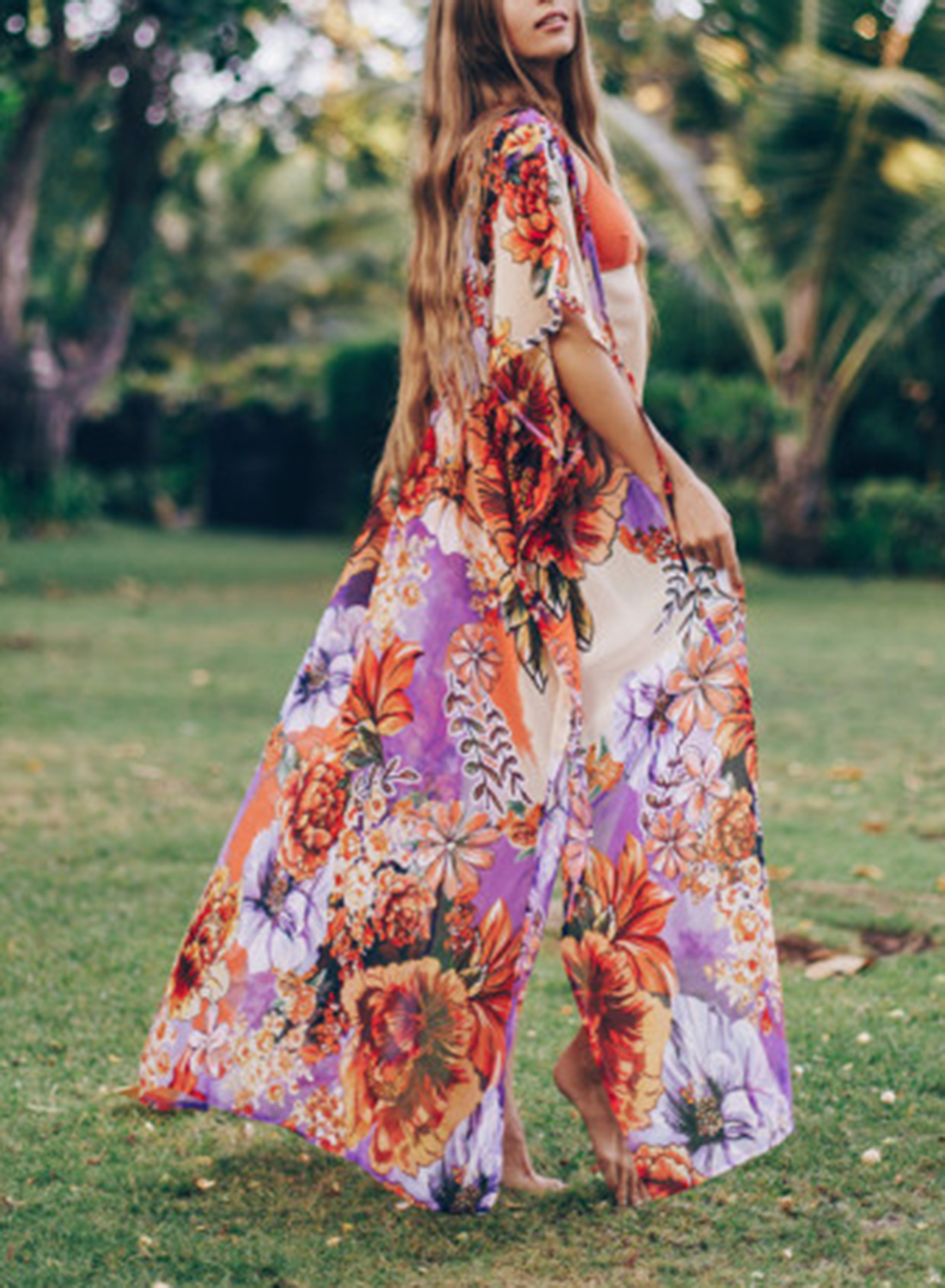 Women's Maxi Dress Floral Color Block A-line Half Sleeve V Neck Knot Casual Beach Maxi Dress