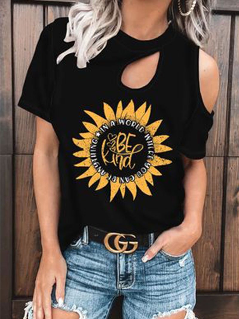 Sunflower be kind printed off-the-shoulder tear-through women's T-shirt