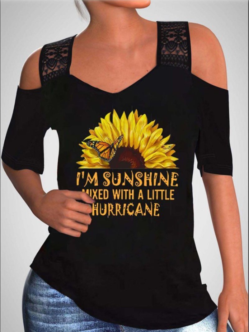 Sunflower Print Hollow Halter Short-sleeved V-neck T-shirt Top