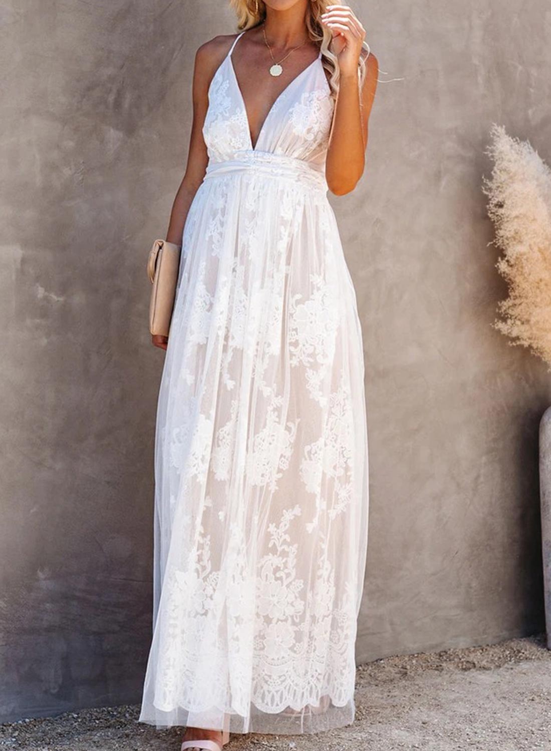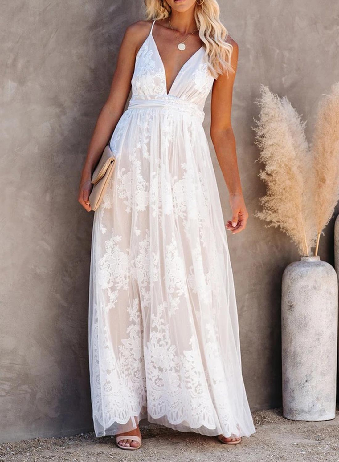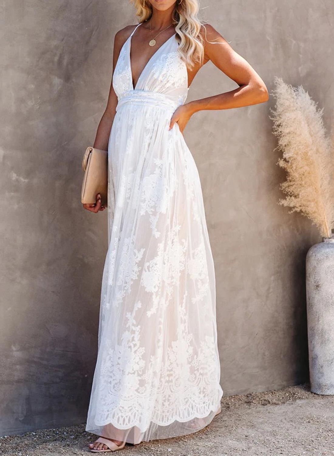 V-Neck Lace Open Back Wedding Maxi Dress