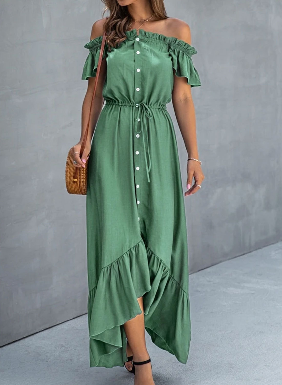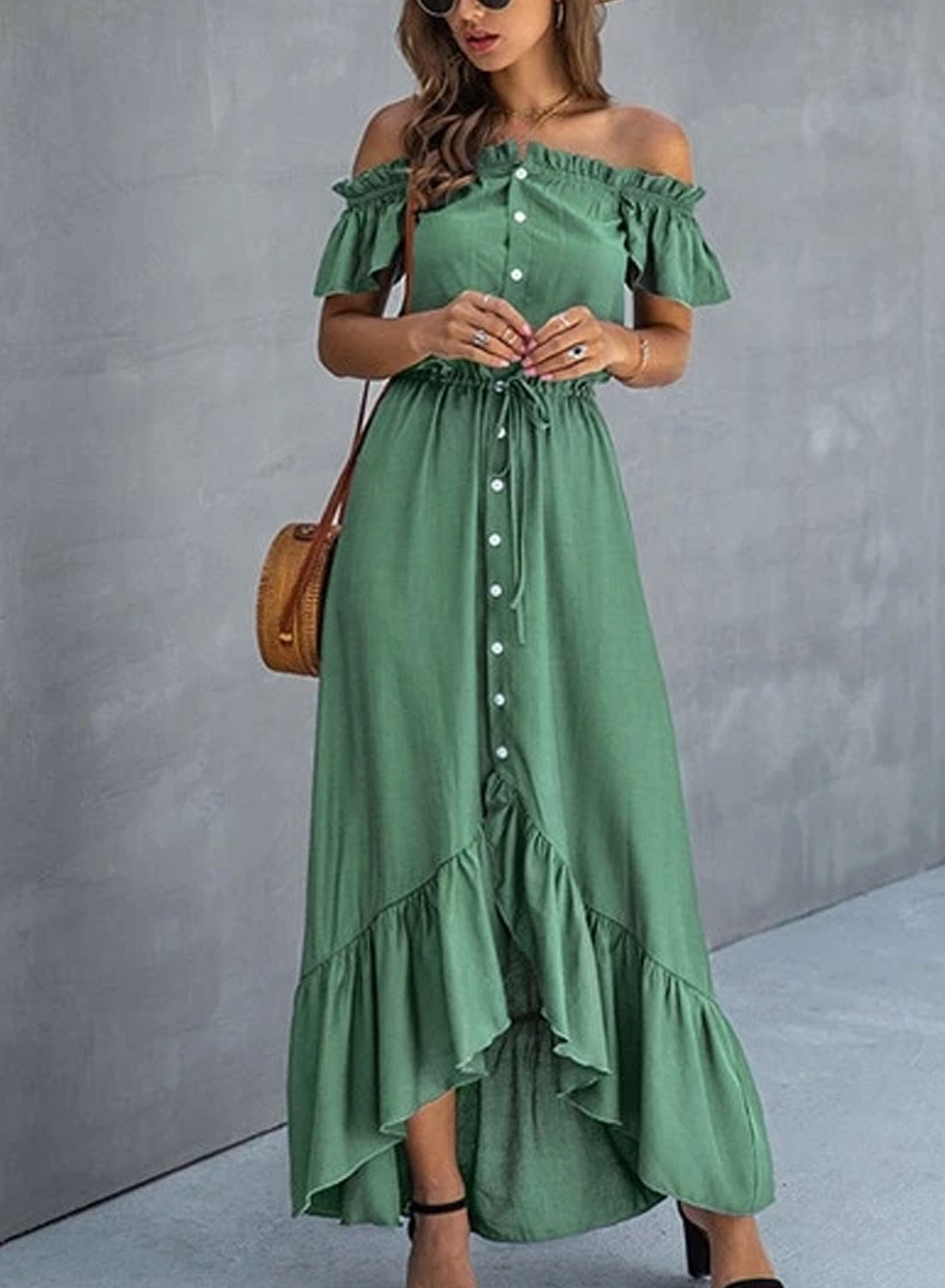 Women's Dress Solid Ruffle Button-up Off Shoulder Maxi Dress